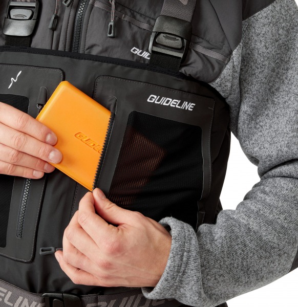 Fabriquées en nylon haute résistance à 4 couches, ces cuissardes sont dotées d'une membrane imperméable (20 000 mm) et respirante (5 000 g/m²/24 h). Un traitement déperlant durable (DWR) sans PFOA, respectueux de l'environnement, protège la surface extérieure des salissures et de l'eau. Grâce à notre conception Sidewinder™, les coutures intérieures sont supprimées, offrant ainsi une grande liberté de mouvement et un confort optimal. Deux grandes poches poitrine, zippées verticalement et dotées d'une face avant en mesh, sont positionnées haut sur la poitrine. À l'arrière, de spacieuses poches chauffe-mains doublées en polaire vous protègent des températures fraîches.