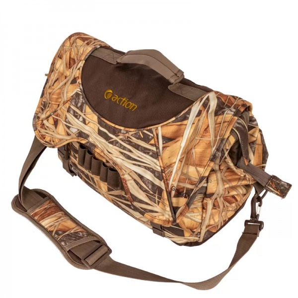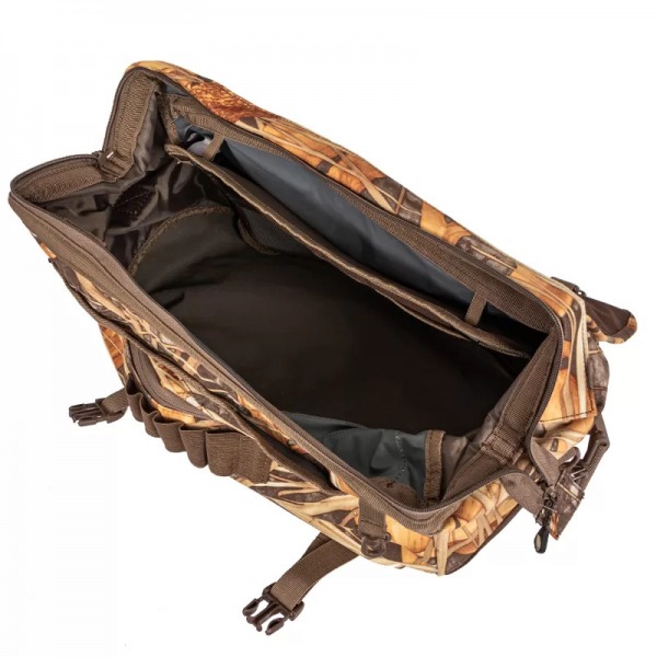 Grand sac de chasse à motif camouflage, conçu pour la chasse aux volatiles. Tissu 2 plis imperméable et anti-bruit. Possède une très grande ouverture avec rabat, un panneau de rangement intérieur amovible et d’une cartouchière à l’avant. Muni d’une poignée coussinée en néoprène et d’une courroie ajustable.